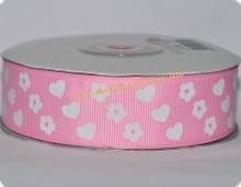 Лента репсовая 25мм розовая с сердцами и цветочками Лента репсовая 25мм розовая с сердцами и цветочками